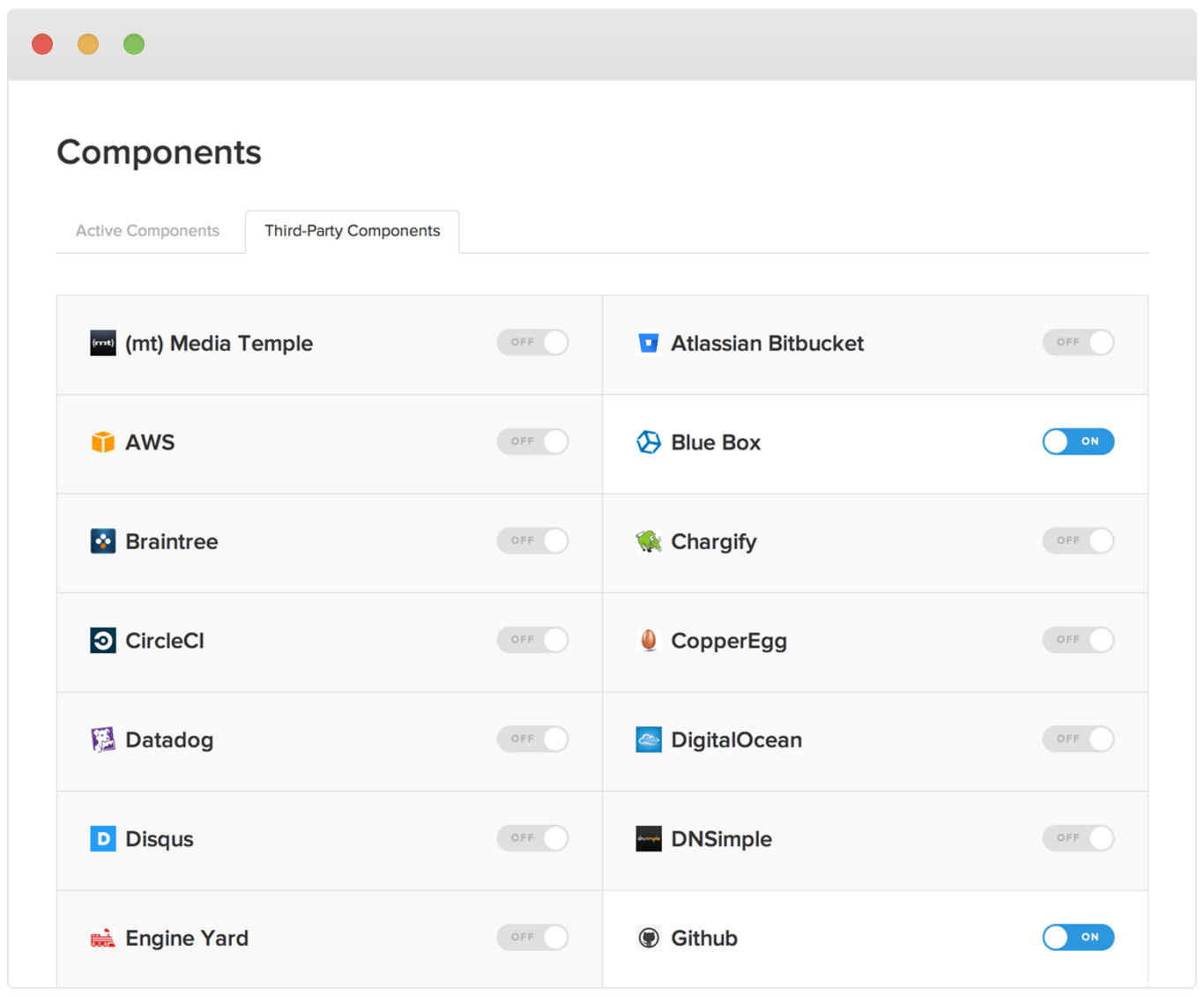 Exiba o status das ferramentas de missão crítica das quais o seu serviço depende. O Statuspage possui a maior e mais rápida rede em crescimento de componentes de serviços de terceiros, como Stripe, Mailgun e PagerDuty. Escolha as ferramentas que você usa.